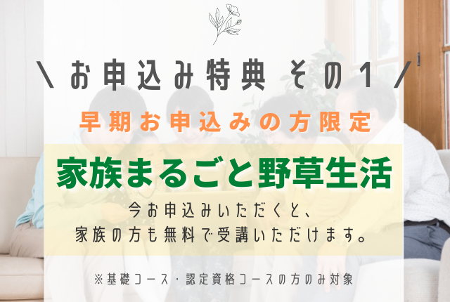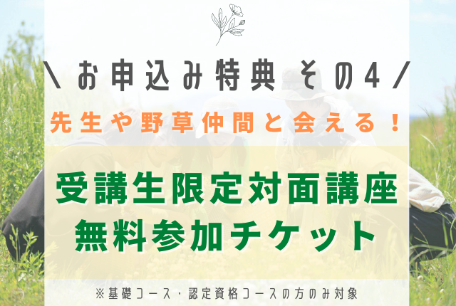 野草マイスターとして、野草講座を開催していきたい方、野草の知識を現在のお仕事に取り入れ、お仕事を生み出していきたい方、野草セラピストとして活動していきたい方、野草を通じて、自分と大切な人を豊かにしていきたい方オススメのコースです。